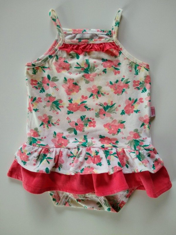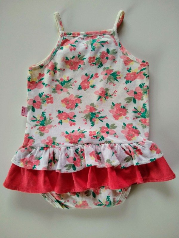 Body sin mangas de algodón estampado con voladitos al tono. Talle M (6-9 meses). Largo total 34 cm. USADO