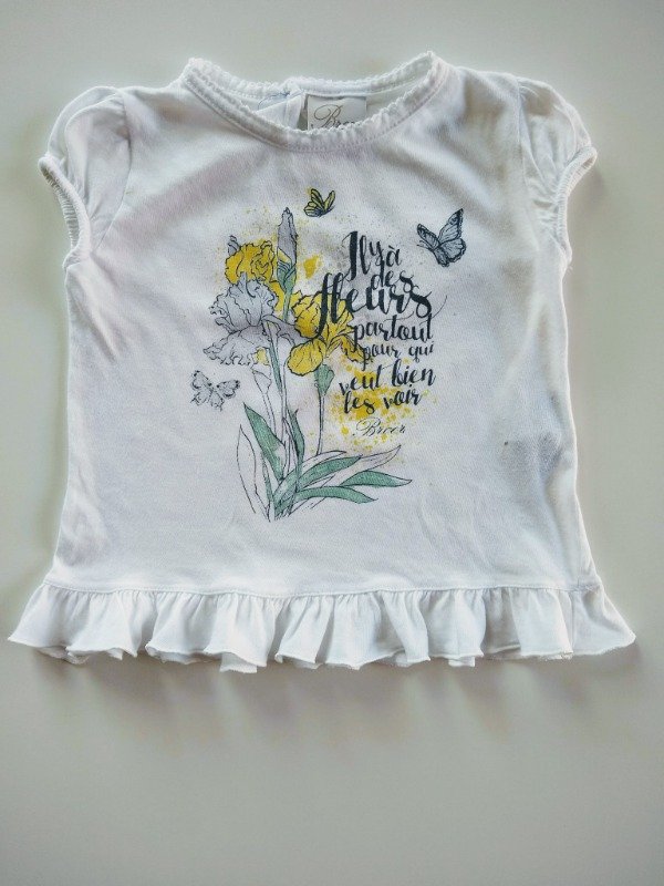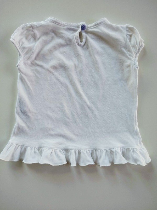 Remera manga corta de algodón color blanco con estampa al frente. Prende con botón en la parte posterior del cuello. Talle 18-24 meses. Medidas: ancho de hombro 22 cm, largo 33 cm. USADO, muy buen estado