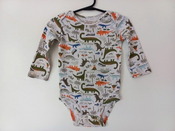 Body manga larga de algodón estampado dinosaurios. Medidas: ancho de hombro 21 cm, largo de manga 26 cm, largo total 43 cm. USADO, buen estado