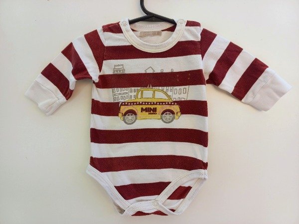 Body manga larga de algodón rayado. Talle S (3-6 meses). Medidas: ancho de hombro 17,5 cm, largo de manga 19 cm, largo total 36 cm. USADO, buen estado
