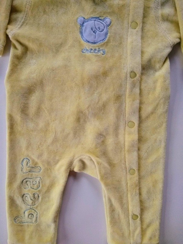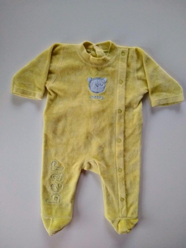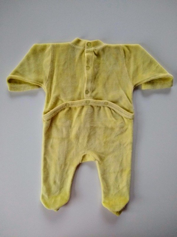 Enterito de plush con apertura con broches en la espalda. Talle XS (0-3 meses). Medidas: ancho de hombros 17,5 cm, largo de mangas 17 cm, largo total 46 cm. USADO, excelente estado