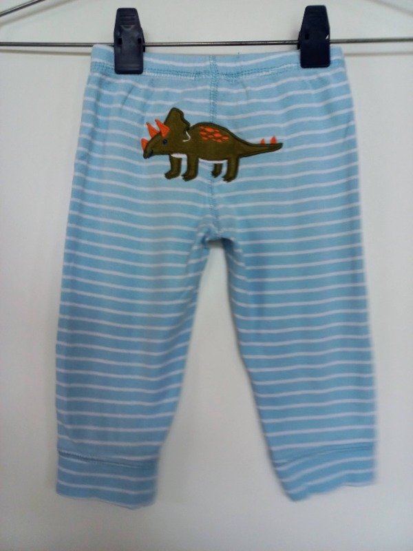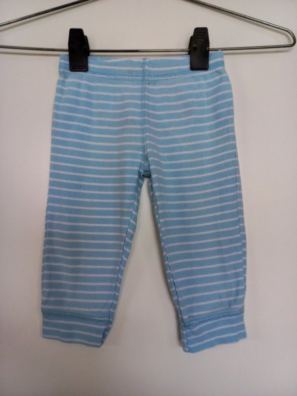 Pantalón de algodón rayado celeste y blanco con aplique en la parte posterior. Medidas: cintura 21 cm, largo 37 cm. USADO, muy buen estado