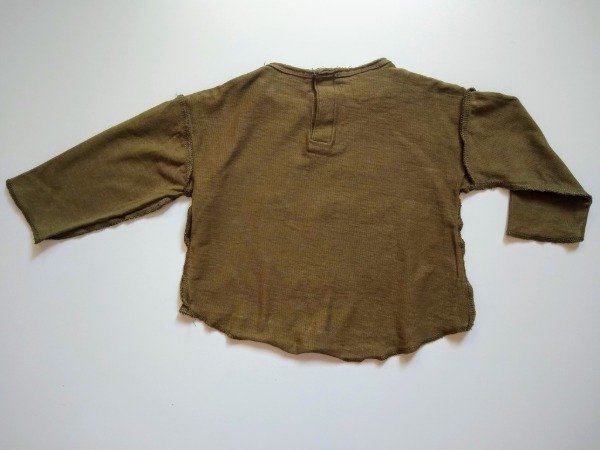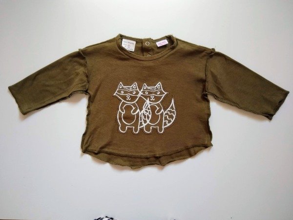 Remera de algodon con aplique de imagen al frente y costuras del reves. Talle 3-6 meses. Medidas: ancho de hombro 30 cm, largo de manga 21 cm, largo total 28 cm. COMO NUEVO