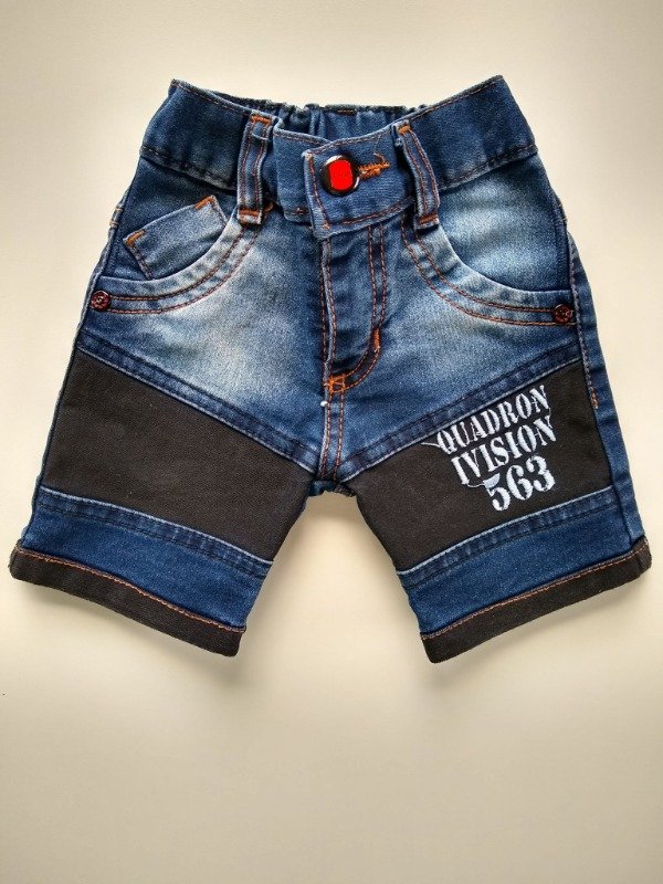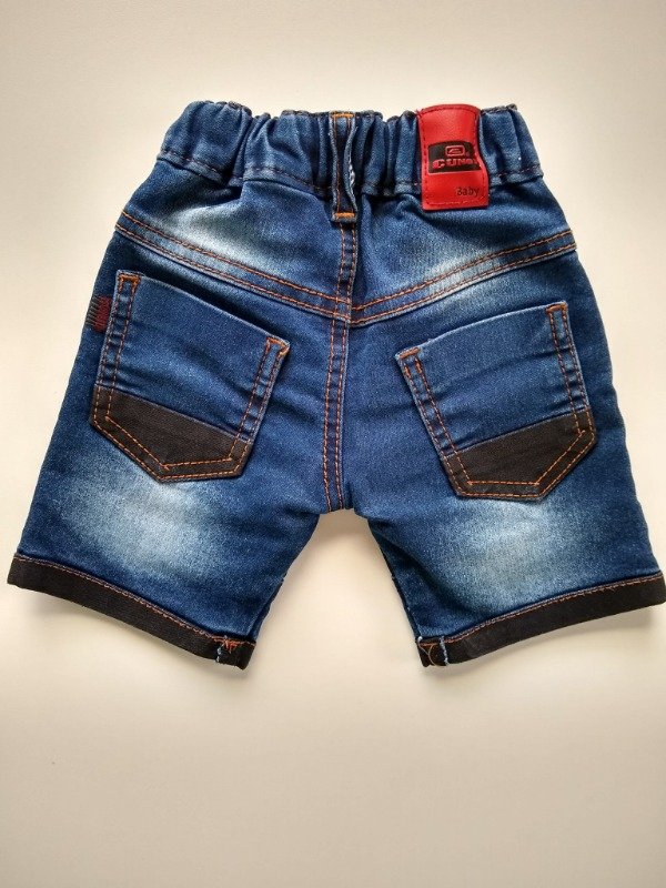 Bermuda de jean azul combinada, con spandex. Talle 1. Medidas: cintura 19,5 cm. largo 24 cm. COMO NUEVO