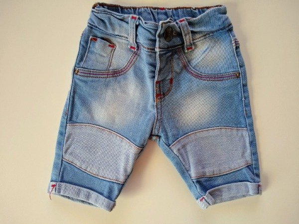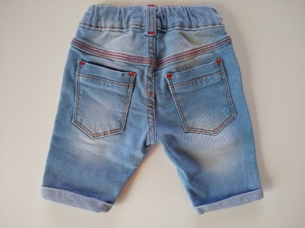 Bermuda de jean elastizada color celeste. Tiene elástico en la parte posterior de la cintura. Talle 1. Medidas: cintura 21 cm, largo 26 cm. USADO, buen estado