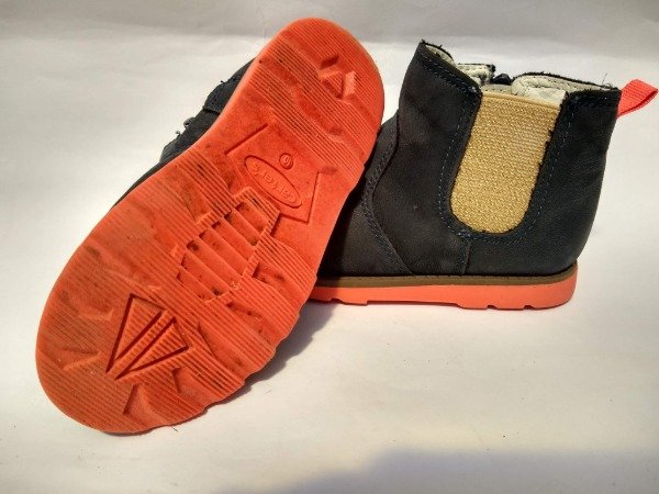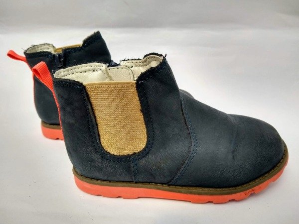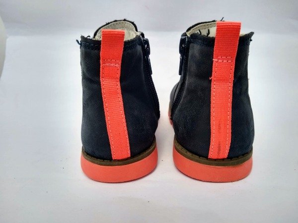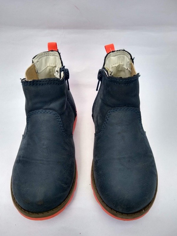 Botinetas de cuero color azul con detalles en color naranja fluor. Tiene cierre en el interior. Plantilla interna 16,5 cm. USADO, buen estado