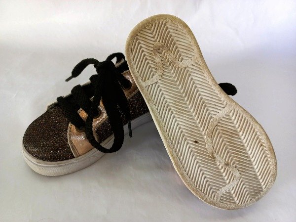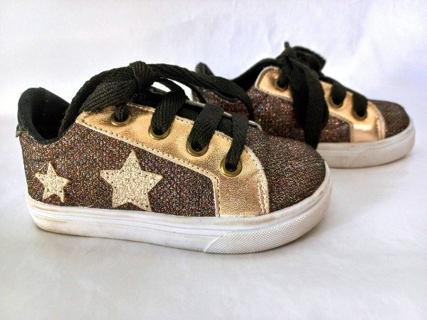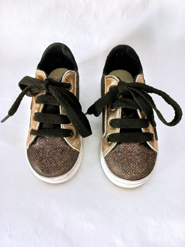 Zapatilla de lona con glitter color marrón con detalles dorados. Plantilla interna 15,5 cm. COMO NUEVO