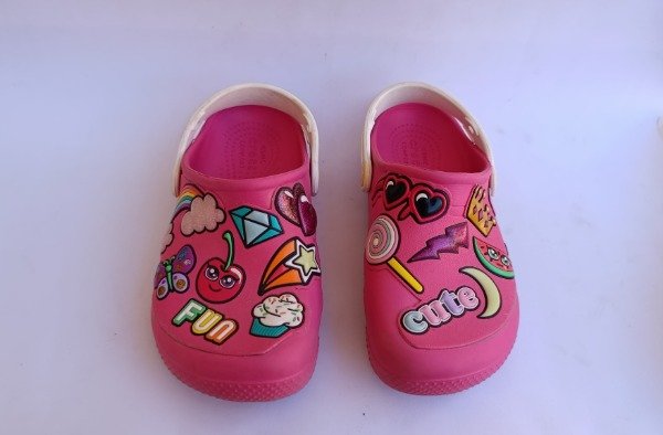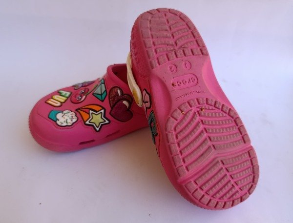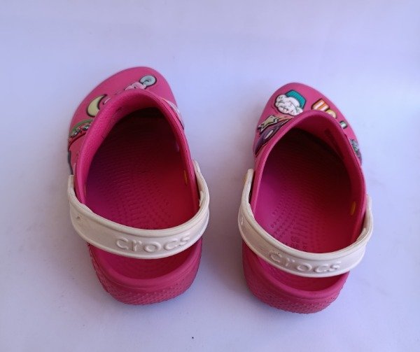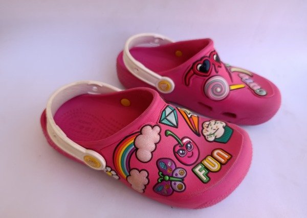 Zuecos de goma en color rosa con estampado. Linea iconic confort de la marca. Talle J2 (30-31). Plantilla interna 19 cm. COMO NUEVO