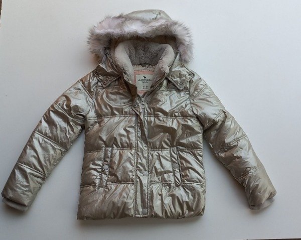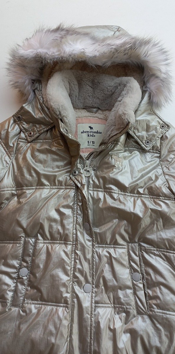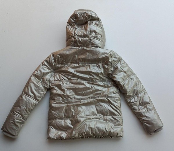 Campera de abrigo en color plateado. Tiene capucha con corderito y el interior del cuerpo en el mismo material. Talle 9-10 años. Medidas: ancho de hombro 38 cm, largo de manga 56 cm, largo total 56 cm. COMO NUEVO