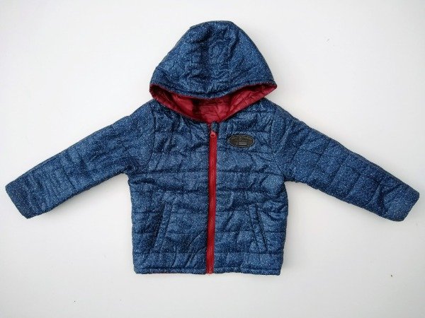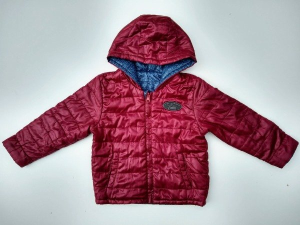 Campera de abrigo reversible, color bordó de un lado y azul estampado del otro. Talle 2/3 años. Medidas: ancho de hombro 29,5 cm, largo de manga 36 cm, largo total 43 cm. USADO, buen estado
