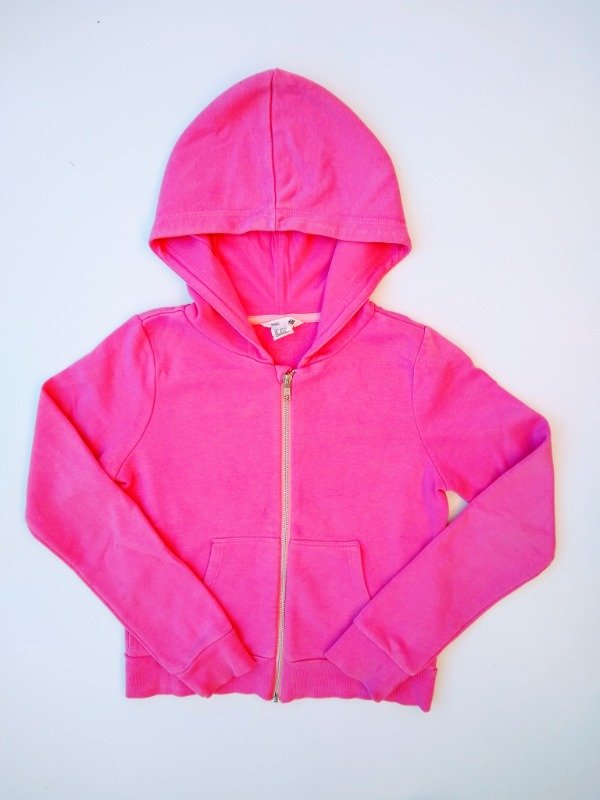 Campera de algodón con friza color rosa. Tiene capucha y bolsillos canguro. Talle 10-12 años. Medidas: ancho de hombro 32,5 cm, largo de manga 60 cm, largo total 50 cm. USADO, buen estado