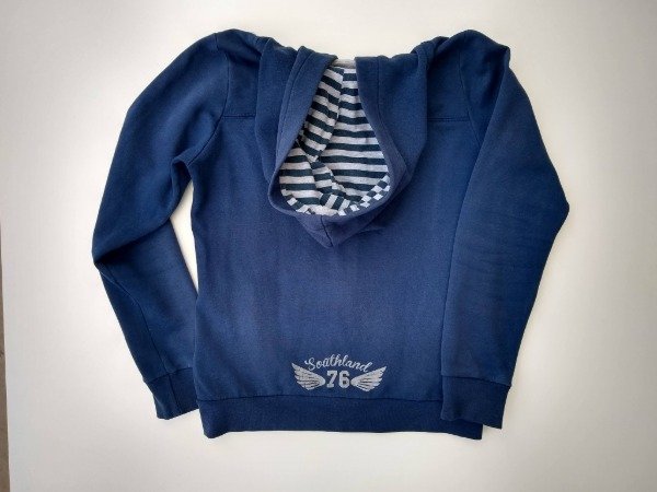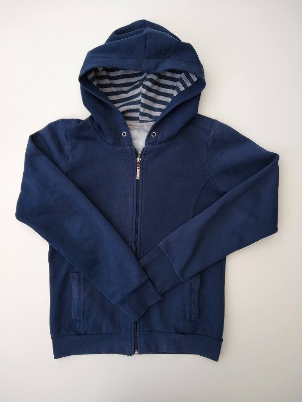 Campera de algodón con friza color azul. Tiene capucha forrada en algodón rallado. Medidas: ancho de hombro 37 cm, largo de manga 61 cm, largo total 60 cm. USADO, buen estado