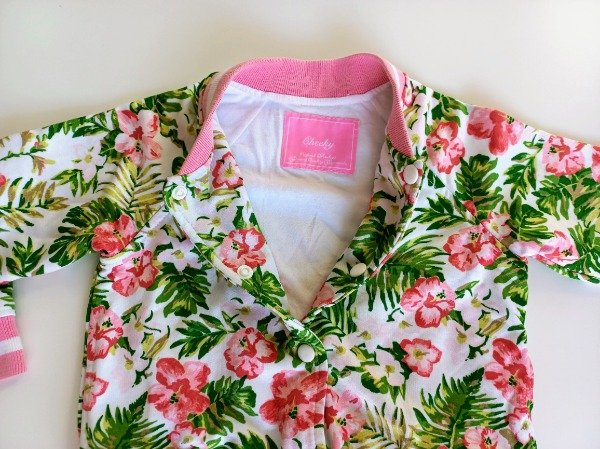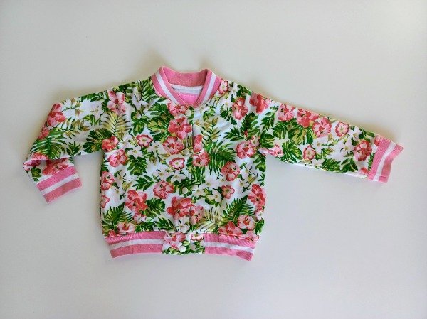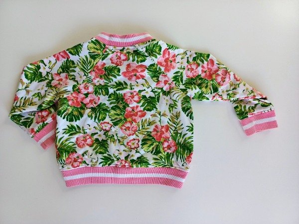 Campera de algodón estampada tipo bomber. Está integramente forrada en su interior en algodón blanco. Prende con broches al frente y tiene dos bolsillos. Medidas: ancho de hombro 34 cm, largo de manga 32 cm, largo total 39 cm. USADO, excelente estado
