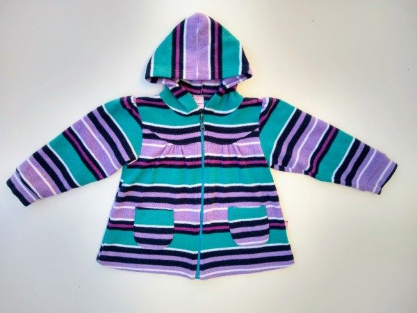 Campera de polar con capucha y bolsillos externos. Medidas: ancho de hombro 29 cm, largo de manga 36,5 cm, largo total 42,5 cm. USADO, buen estado