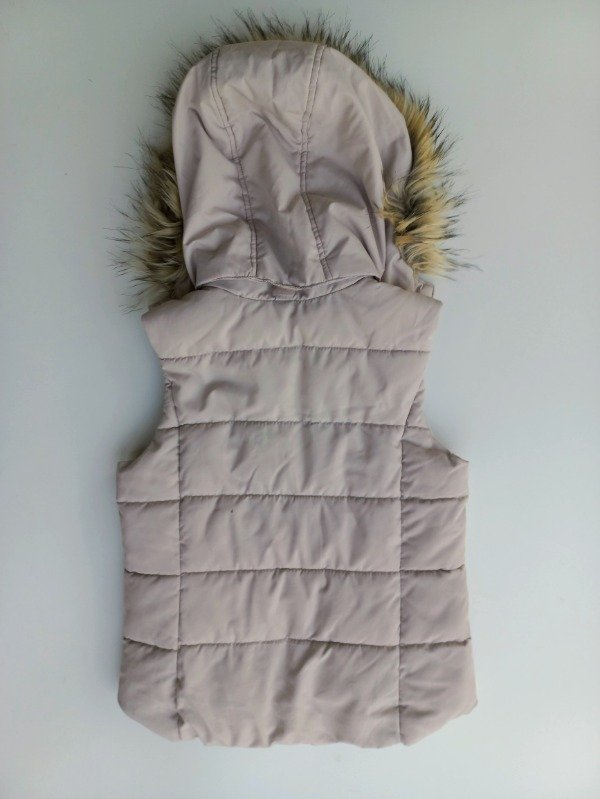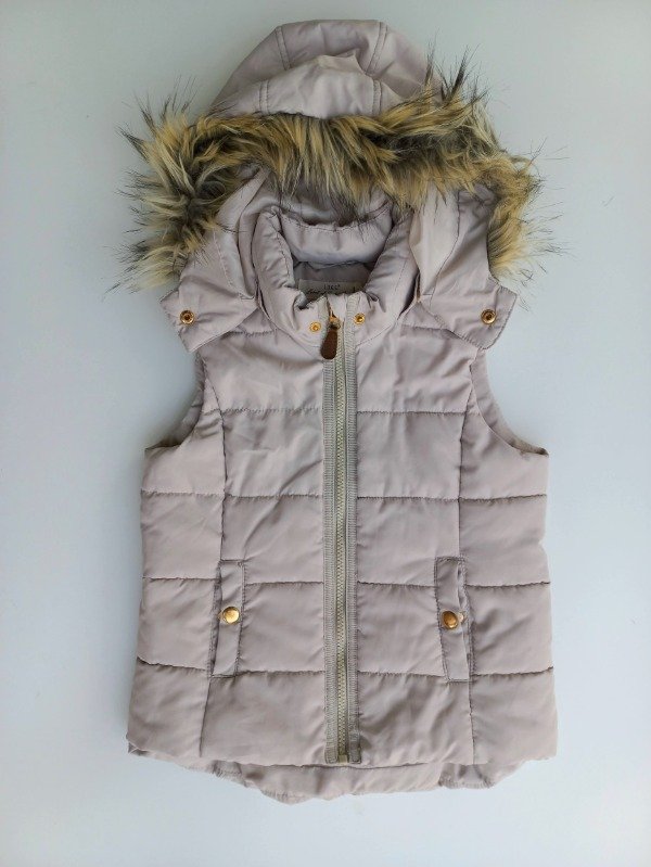 Chaleco de abrigo color beige. Tiene capucha desmontable con terminación en piel. Talle 6-8 años. Medidas: ancho de hombro 31 cm, largo 52 cm. COMO NUEVO