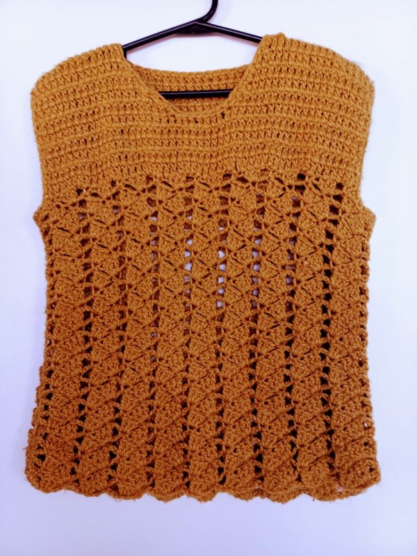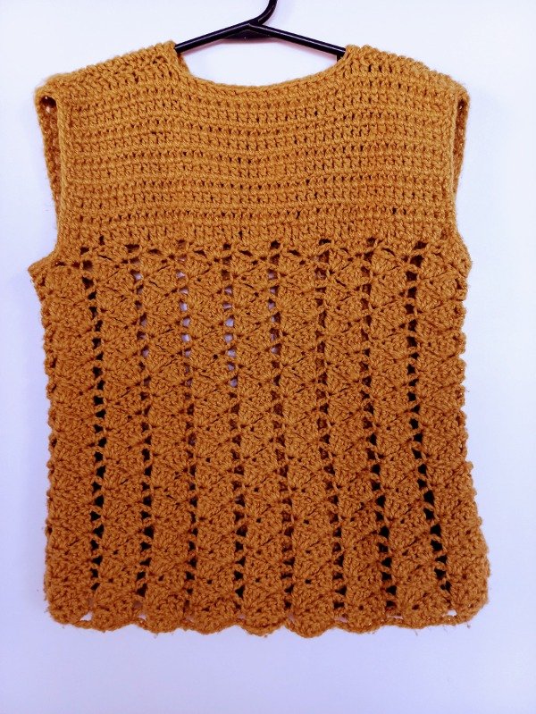 Chaleco tejido en lana en color mostaza. Medidas: ancho de sisa a sisa 41 cm, largo 48 cm. USADO, buen estado