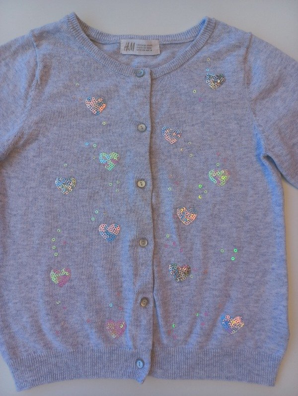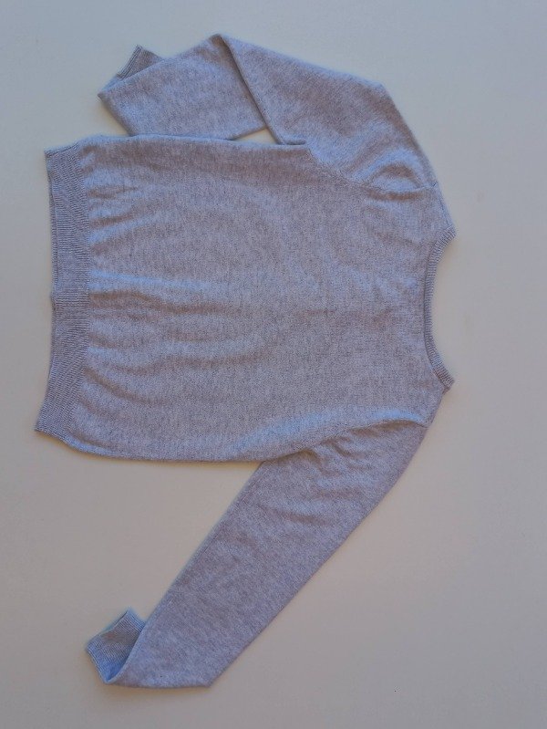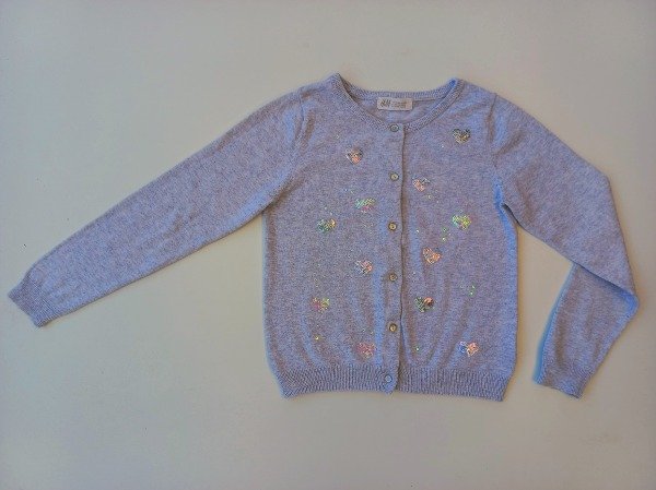 Saquito de hilo color gris melange con bordado en lentejuelas al frente. Talle 6-8 años. Medidas: ancho de hombro 29 cm, largo de manga 53 cm, largo total 46 cm. USADO, muy buen estado