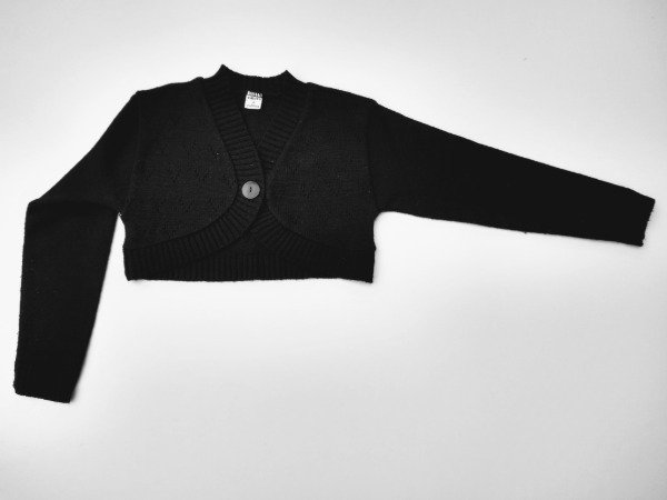 Torerita de lana en color negro. Medidas: ancho de hombro 33,5 cm, largo de manga 41 cm, largo total 28 cm. USADO