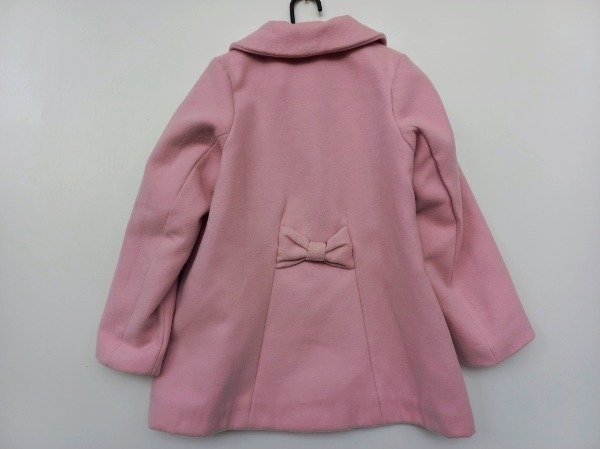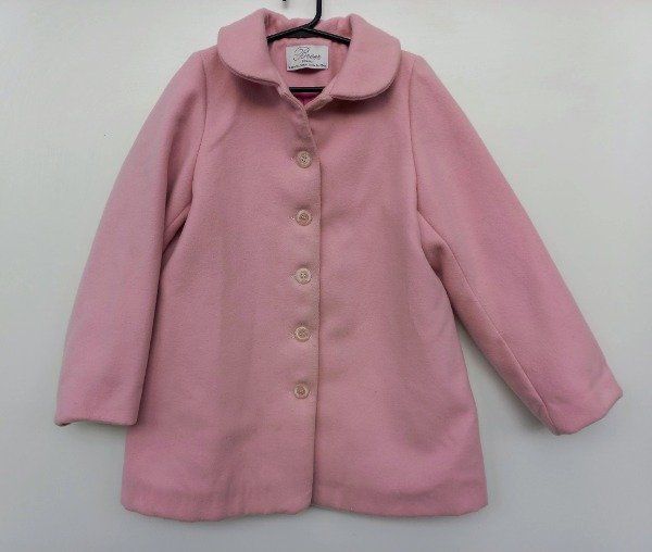 Tapado de paño en color rosado, forrado integramente en seda al tono. Talle 7-8 años. Medidas: ancho de hombro 28 cm, largo de manga 49 cm, largo total 59 cm. COMO NUEVO