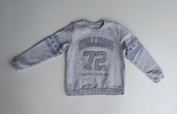 Buso de algodón con frisa en color gris melange. Medidas: ancho de hombro 28 cm, largo de manga 45 cm, largo total 44 cm. COMO NUEVO