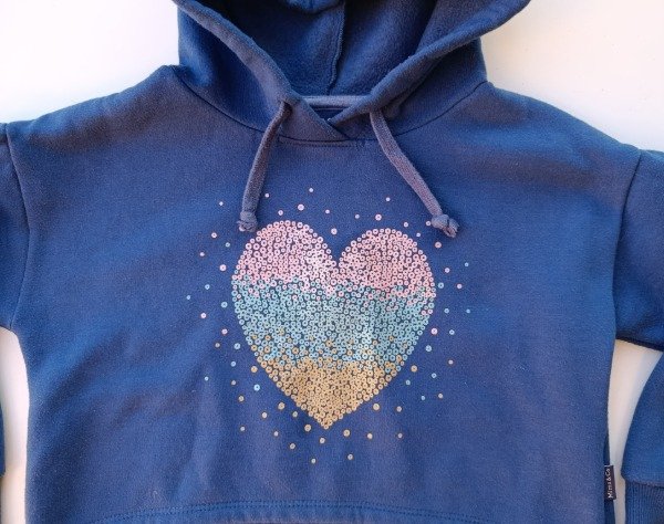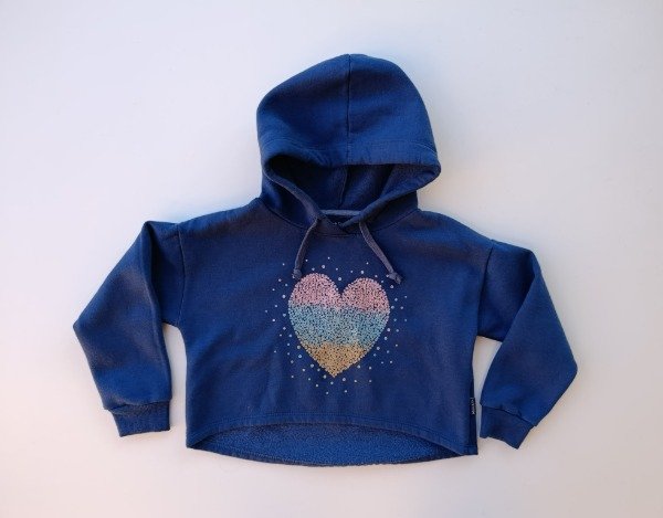 Buzo de algodón con frisa en color azul con estampa con brilo. Medidas: ancho de hombro 45 cm, largo de manga 35 cm, largo total 37 cm. COMO NUEVO