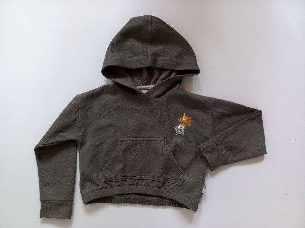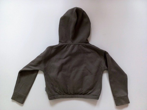 Buzo de algodón con frisa color verde seco. Tiene capucha y bolsillos canguro. Terminación con elástico. Medidas: ancho de hombro 40,5 cm. largo de manga 37 cm, largo total 34 cm. USADO