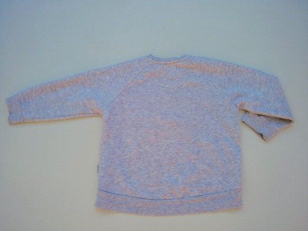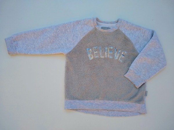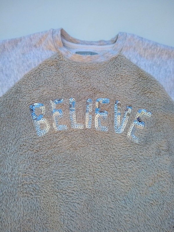 Buzo de algodón con friza con frente de sherpa color gris melange. Tiene inscripción con lentejuelas. Medidas: ancho de hombro 39 cm, largo de manga 35 cm, largo total 46 cm. USADO