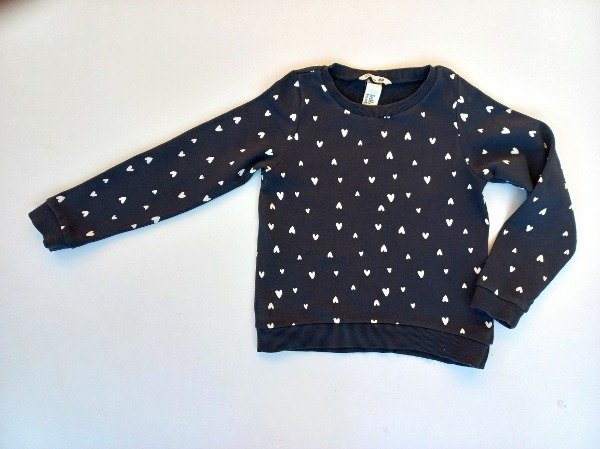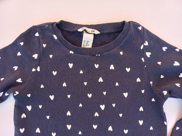 Buzo de algodón rústico en color azul con estampado corazones. Talle 6-8 años. Medidas: ancho de hombro 26 cm, largo de manga 49 cm, largo total 45 cm. COMO NUEVO