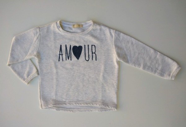 Buzo de algodón rústico color gris melange con inscripción con glitter. Talle 7/8 años. Medidas: ancho de hombro 37 cm, largo de manga 40 cm, largo total 45 cm. USADO, excelente estado