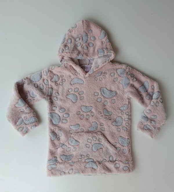 Buzo de peluche en color rosado con patitas en gris. Tiene capucha y bolsillo canguro. Medidas: ancho de hombro 36 cm, largo de manga 38 cm, largo total 48,5 cm. USADO, buen estado