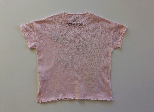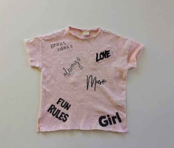 Buzo manga corta de algodón rústico color rosado con bordados y apliques al frente. Medidas: ancho de sisa a sisa 45 cm, largo 50 cm. COMO NUEVO