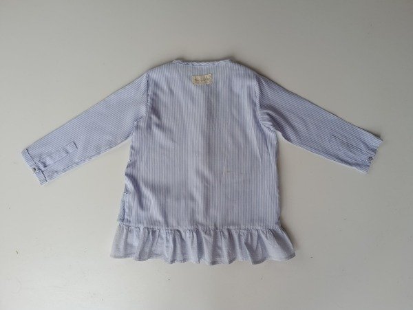 Camisa manga larga de poplin rayado celeste y blanco, con terminación en volados. Medidas: ancho de hombro 25 cm, largo de manga 34 cm, largo total 46,5 cm. USADO, buen estado