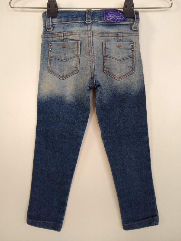 Jean azul localizado con elastano. Tiene detalles de tachas en los bolsillos. Medidas: cintura 22 cm, largo 56 cm. USADO, excelente estado
