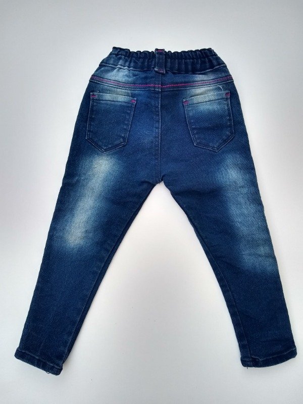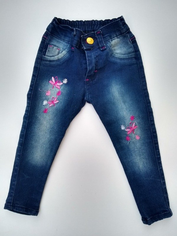 Jean elastizado chupín en color azul localizado con bordado al frente. Tiene elástico en la parte posterior de la cintura. Medidas: cintura 22 cm, largo total 47 cm. NUEVO SIN ETIQUETA