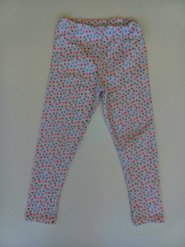 Calza de lycra de algodón fondo blanco con lunares con brillo en tonos pasteles. Talle 5-6 años. Medidas: cintura 22,5 cm, largo 58 cm. USADO