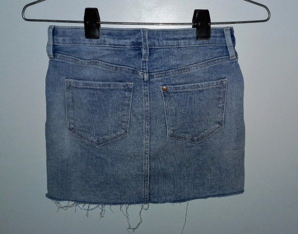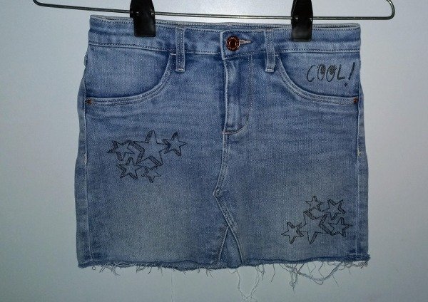 Pollera minifalda de jean elastizado color azul con estampas al frente. Tiene elástico y botón en la cintura para ajustar el calce Talle 8-9 años. Medidas: cintura 30 cm, largo 30 cm. COMO NUEVO