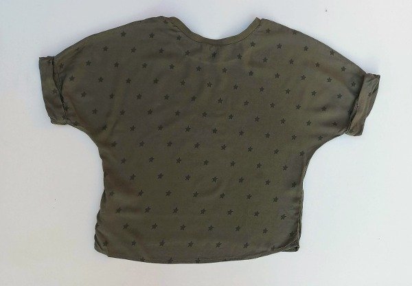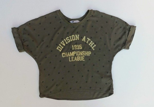 Blusa manga corta de viscosa color verde militar estampada con letras doradas al frente. Talle 11-12 años. Medidas: ancho de sisa a sisa 51 cm, largo 52. USADO
