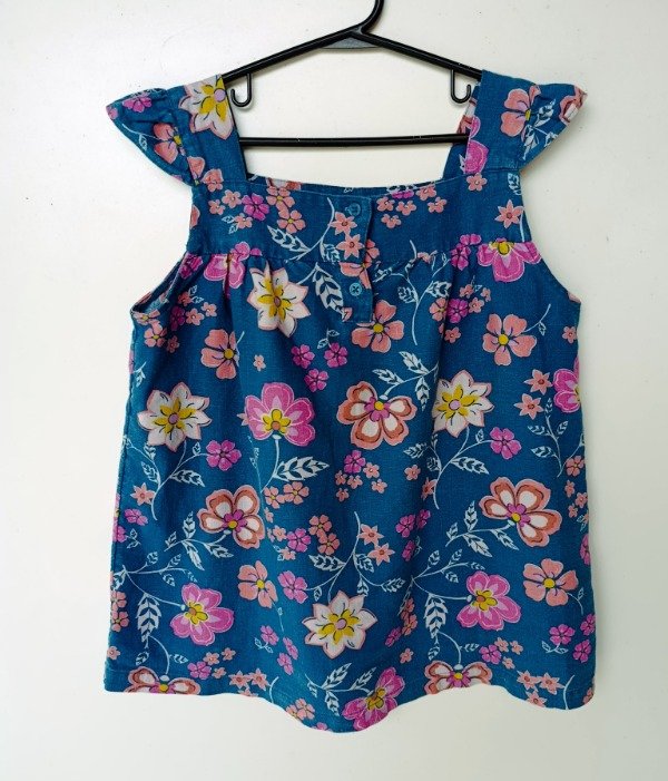 Blusa sin mangas de fibrana estampada. Medidas: ancho de sisa a sisa 41 cm, largo 50 cm. USADO, buen estado