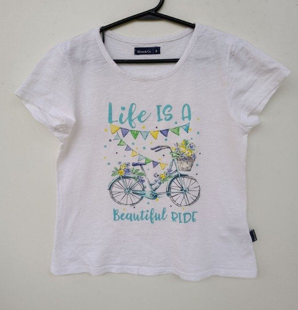Remera manga corta de algodón en color blanco con estampa con brillo al frente. Medidas: ancho de hombro 30 cm, largo 46 cm. COMO NUEVO