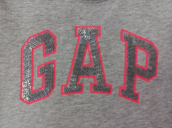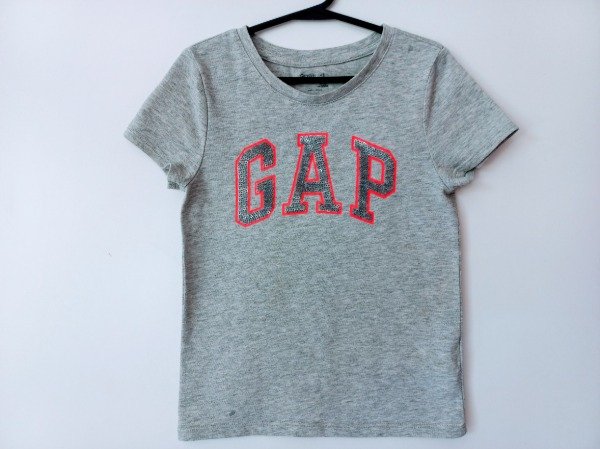 Remera manga corta de algodón color gris melange con letras de la marca en lentejuelas. Talle 6-7 años. Medidas: ancho de hombro 28 cm, largo 47 cm. USADO, buen estado