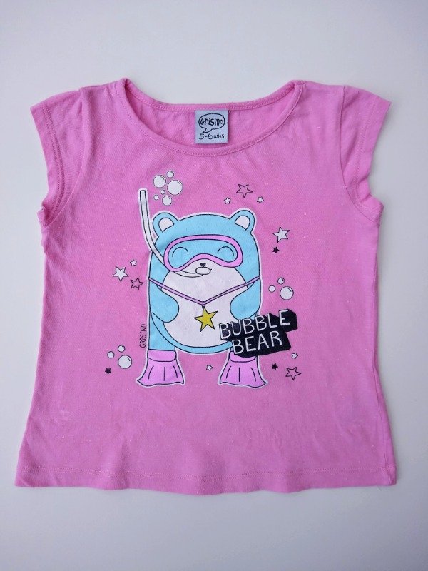 Remera manga corta de algodón fantasía color rosado. Talle 5-6 años. Medidas: ancho de hombro 25 cm, largo 40,5 cm. USADO, muy buen estado