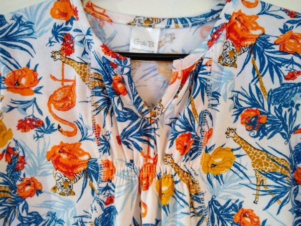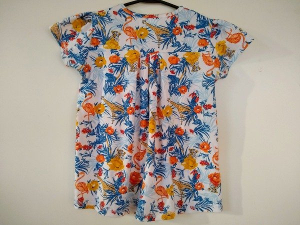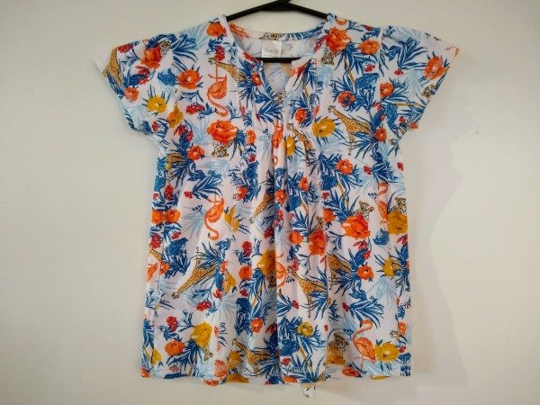 Remera manga corta de algodón estampada con frunce en el frente y tablitas en la espalda. Medidas: ancho de hombro 30 cm, largo 48 cm. USADO, excelente estado