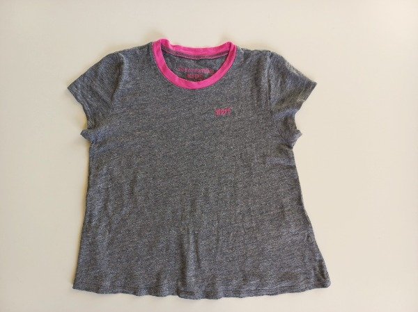 Remera manga corta de algodón color gris plomo con combinado rosa. Talle 7-8 años. Medidas: ancho de hombro 30 cm, largo 48 cm. USADO, buen estado