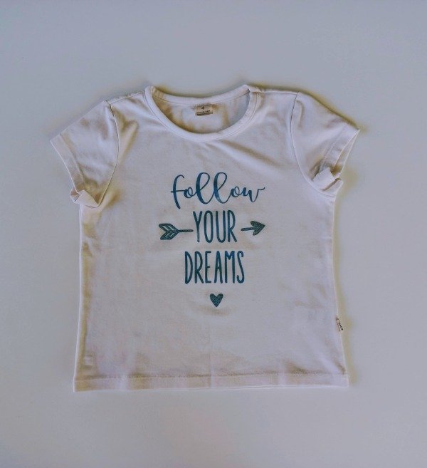 Remera manga corta de algodón color blanco con inscripción con brillos al frente. Medidas: ancho de hombro 24 cm, largo 38,5 cm. COMO NUEVO