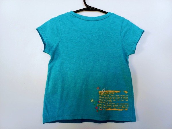 Remera manga corta de algodón color turquesa con bordado al frente y en extremo inferior de la espalda. Medidas: ancho de hombro 23 cm, largo 40 cm. USADO, buen estado
