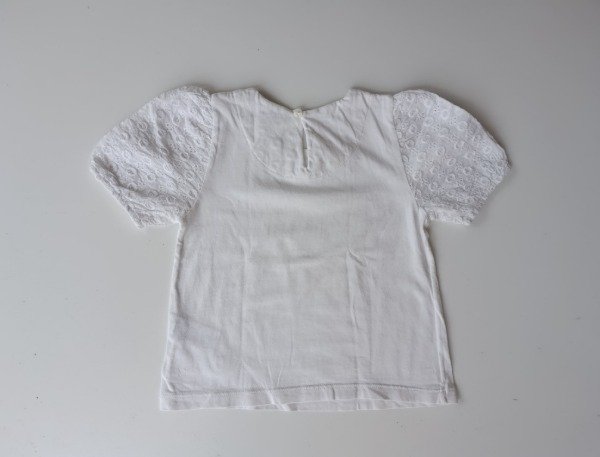 Remera manga corta de algodón con color blanco con detalles de broderie en mangas. Medidas: ancho de hombro 21 cm, largo 36 cm. COMO NUEVO