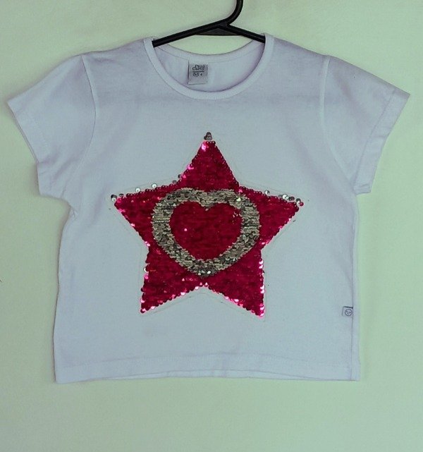 Remera manga corta de algodón tipo pupera. Color blanco con estampa en lentejuelas bifaz. Medidas: ancho de hombro 27 cm, largo 36 cm. COMO NUEVO