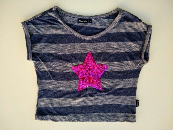 Remera manga corta de algodón rallada con estrella bordada en lentejuelas al frente. Largo total 39 cm. USADO