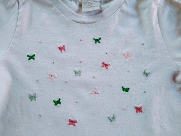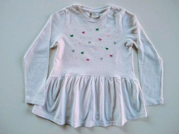 Remera de algodón terminada en volado y bordado en el frente. Talle 7/8 años. Medidas: ancho de hombro 28 cm, largo de manga 48,5 cm, largo total 54 cm. COMO NUEVO