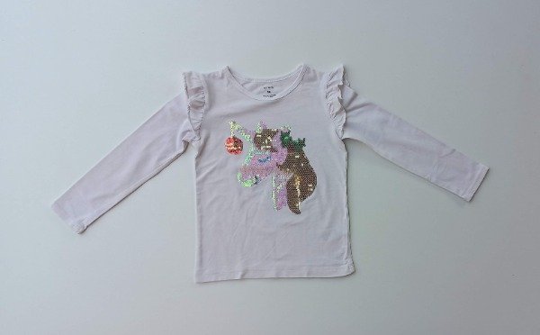 Remera manga larga de algodón en color blanco con estampa en lentejuelas . Tiene terminación de volados en los hombros. Medidas: ancho de hombro 27,5 cm, largo de manga 40 cm, largo total 43,5 cm. USADO, buen estado